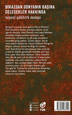 Borges’e inanmak lazım gelirse Pierre Menard, Don Quijote’yi baştan yazmaya çalışmış ve bu uğurda ölmüştü. Ama Menard, nasıl yaptı bilinmez, elinizdeki kitapla yeniden canlanıyor, saat kulelerinin, zürafaların ve çift başlı çocukların arasından geçip gidiyor. Zaman akıyor, biz de onun peşine düşüyoruz. Veysel Gökberk Manga bu kitapta, yalanlar üstüne kurduğu bir anlatıyı, Latin Amerika’ya hiç benzemeyen bazı yerlerde ucube bir büyülü gerçekçilik taklidine çeviriyor. Evet, yazar bize yalan söylüyor. Fakat müsterih olun, biz de şunu çok iyi biliyoruz ki yazar yalan söylemez, asla yalan söylemez, sadece fikrini değiştirir. İşte, şimdiye değin hiçbir fikrinde sebat etmemiş yazar, sizi bu kitapla Arjantin gibi İran gibi bir Türkiye’nin sokaklarında dolaşmaya davet ediyor. Davete icabet edip etmemek tamamen size kalmış.